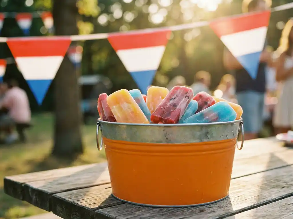 Kleurrijke bevroren cocktail ijslollies in oranje emmer op houten picknicktafel met Nederlandse vlaggetjes op achtergrond