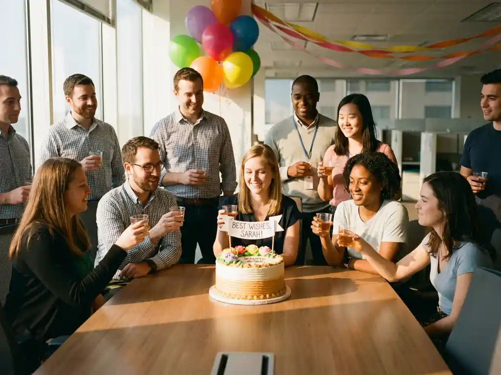 Collega's vieren afscheid rond versierde taart op kantoor met ballonnen en champagne in warm zonlicht