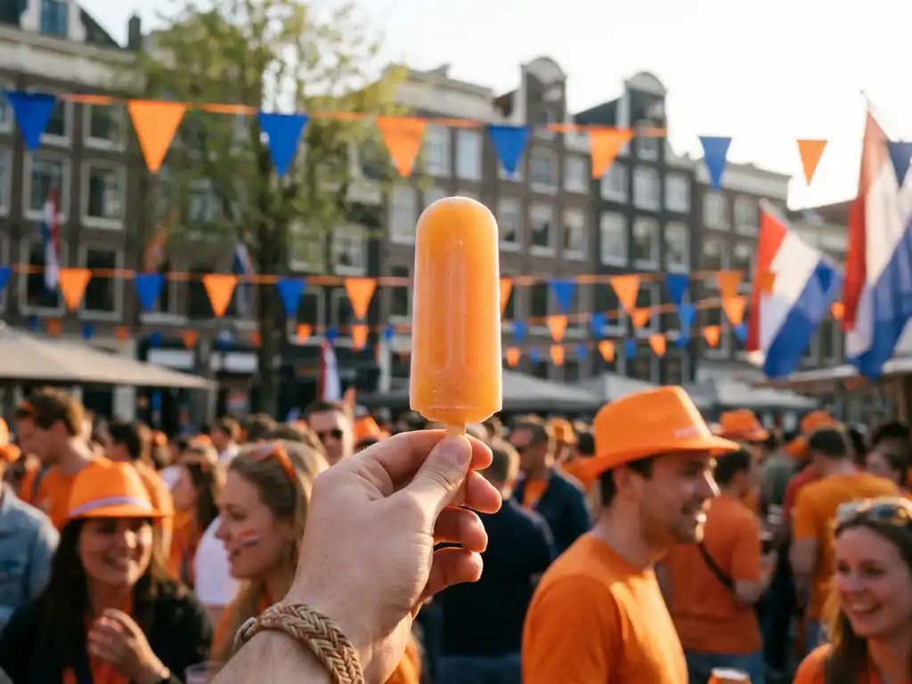 Oranje ijslolly wordt omhooggehouden tijdens Koningsdag viering met oranje versiering en grachtenhuizen op achtergrond