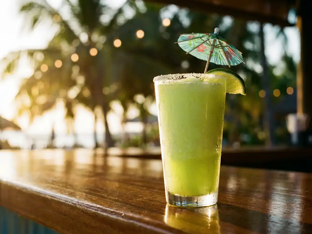 Bevroren margarita cocktail met papieren parasol en limoen op houten bar, condensdruppels zichtbaar op glas
