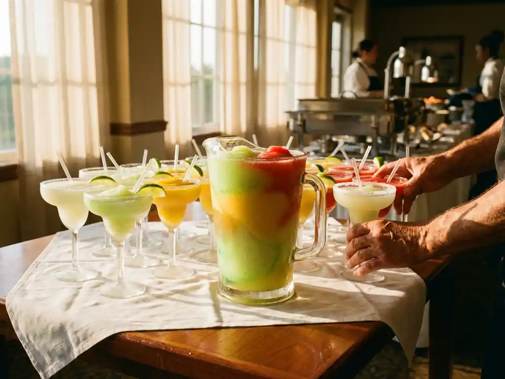 Großer Glaskrug mit gefrorenen Margaritas auf Catering-Tisch, umgeben von Cocktailgläsern und Limetten-Garnituren