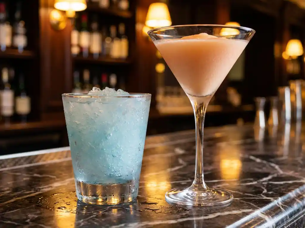 Zwei gefrorene Cocktails auf Marmorbar: grober Slush in frostigem Glas neben cremigem Frozen Drink im Martini-Glas