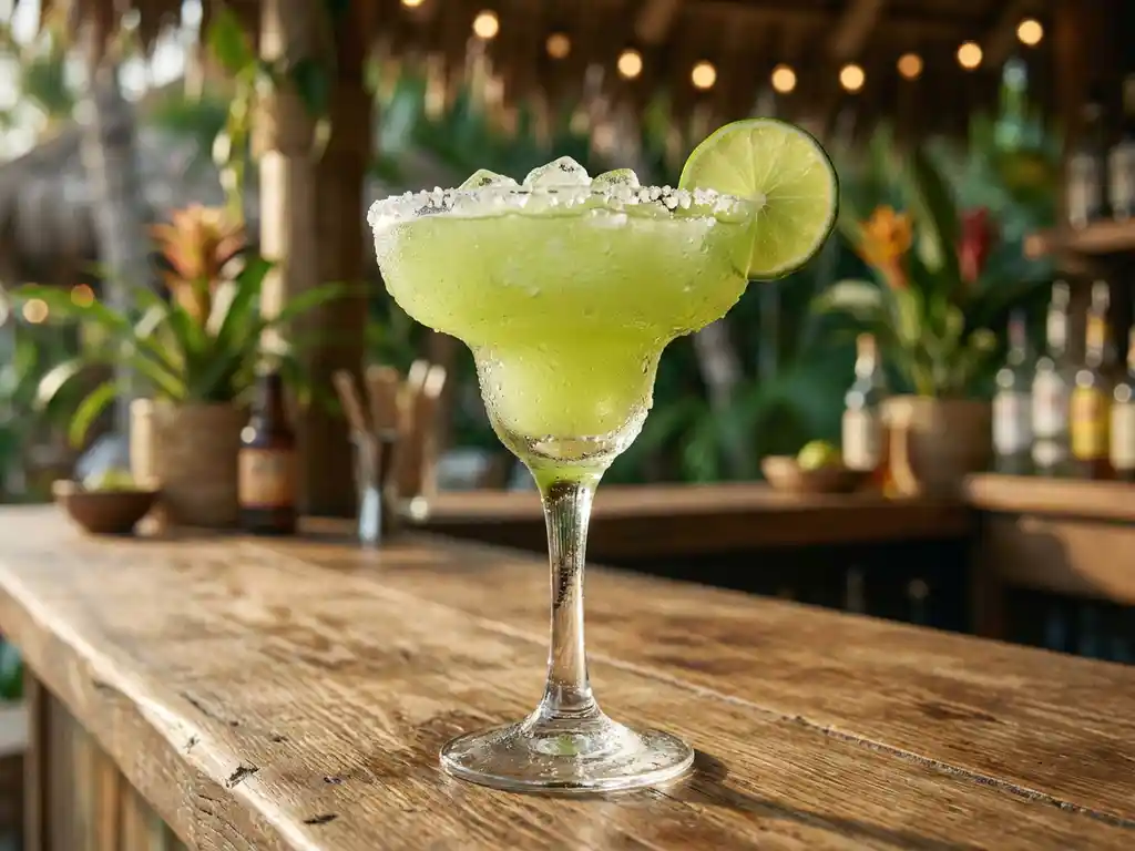 Gefrorene Margarita mit Limette und Salzrand auf rustikaler Holztheke in tropischer Bar-Atmosphäre