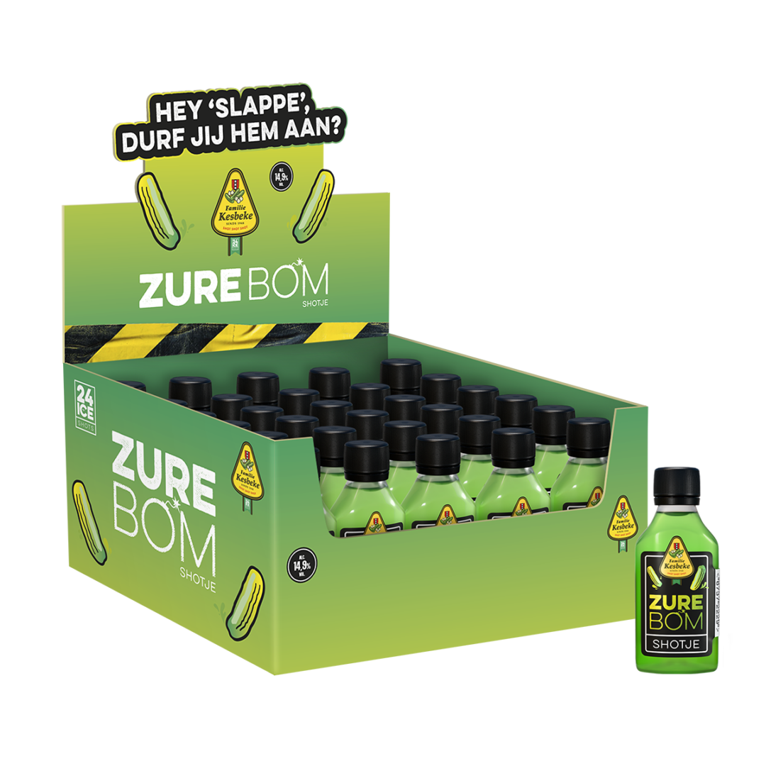 Deze Kesbeke Zure Bom shots hebben een alcoholpercentage van 14,9% en staan garant voor een smaak die blijft hangen. IJskoud geserveerd komen ze het best tot hun recht – al waarschuwen we alvast: zuur is hier geen bijzaak, maar het hoofdthema.